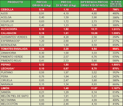 Pero el alimento que ha protagonizado el mayor aumento ha sido el pepino, su diferencia porcentual se establece en un 1.500%, hasta 15 veces más pagamos los consumidores por los pepinos. Los productores perciben 0,12 euros por kilo y los consumidores pagamos 1,80 euros por kilo. La diferencia es totalmente especulativa, nos encontramos en temporada de pepinos y parece que se intenta sacar la máxima tajada de ellos. Hay que decir que ya el mes pasado la diferencia era notable, alcanzaba un 12,06 de diferencia entre el precio de origen y destino.