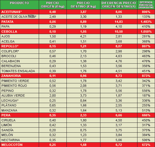 Otro producto con márgenes especulativos es la cebolla, en el mes de agosto los agricultores percibían por un kilo de cebollas 0’09 euros, en el mes de septiembre han percibido un céntimo más, una subida que no sabe a nada y que parece ridiculizar a los agricultores. Los consumidores seguimos pagando el mismo precio, 1’05 euros por kilo, con lo que la diferencia entre el precio de origen y destino se sitúa en un 10’50 veces.