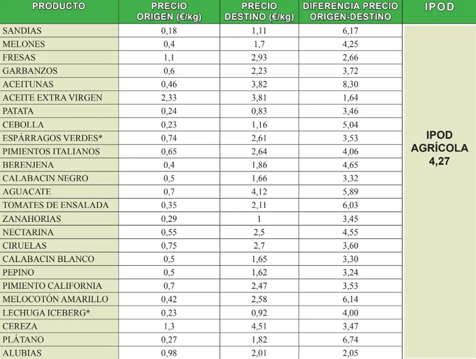El IPOD ofrece información que ha sido elaborada de forma conjunta por dos de las partes implicadas en la cadena agroalimentaria, precisamente los extremos, agricultores y consumidores. De este modo, al cotejar los datos sobre los precios que pagan los intermediarios a los agricultores y los precios a los que se venden los alimentos a los consumidores, se puede obtener el valor real del encarecimiento de los productos. En la fotografía podéis comprobar algunos de los datos que nos ofrece el IPOD correspondiente al pasado mes de junio.