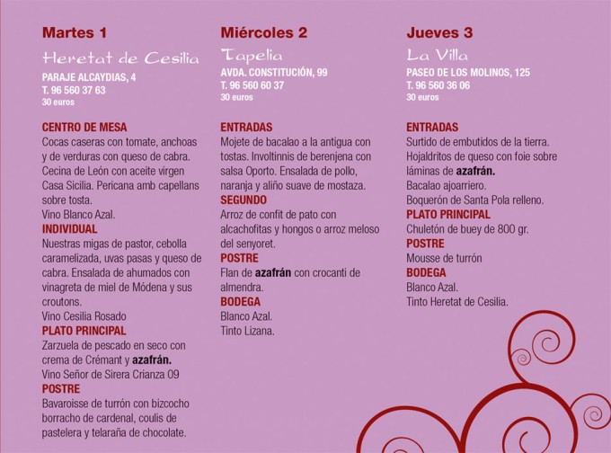 Los nueve restaurantes participantes son: Heretat de Cesilia, Tapelia, La Villa, La Candeleta, Pla Casa Coca, Nou Cucuch, La Taverneta, Palacios, y Juan y Tere, en este orden, del día 1 al 9 de febrero cada uno ofrecerá un menú a precio fijo de 30 euros. Podéis ver la composición en las imágenes, además de recetas de cocina tradicional alicantina y algo de cocina creativa, destacamos algunos platos con azafrán que son los que deben ser protagonistas.