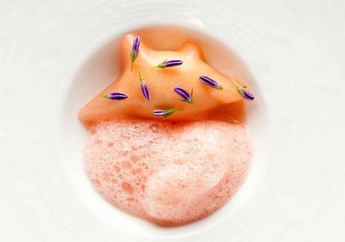 En el menú que el cocinero Toño Pérez creó con motivo del 30 aniversario del Restaurante Atrio (2 estrellas Michelin), en el que el cerdo ibérico era el producto homenajeado, además de platos como el ‘Atún ibérico’ macerado en matanza con boniato y papada, presentó la belleza de plato que podéis ver en las fotos, se llama Jamón, mahonesa y tomate. Es un plato fresco e intenso por la pureza de sus sabores, se necesitan pocos ingredientes pero una elaboración muy cuidada, que no complicada.