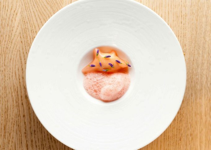 Colocar los tacos de jamón ibérico en la base del plato, el sorbete de mahonesa y tomate, la gelatina y repartir las flores comestibles.