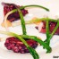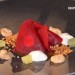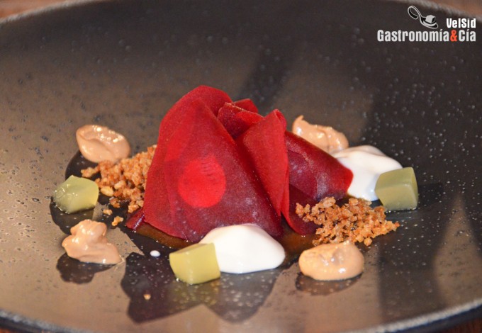 En el centro del plato sirve el escabeche de pularda con láminas finas de remolacha cocida, y añade la piel de pollo con cebolla frita, la gelatina de manzana, la piel de yogur y la mousse de pularda. Este es el plato de Remolacha con pularda de Mos.