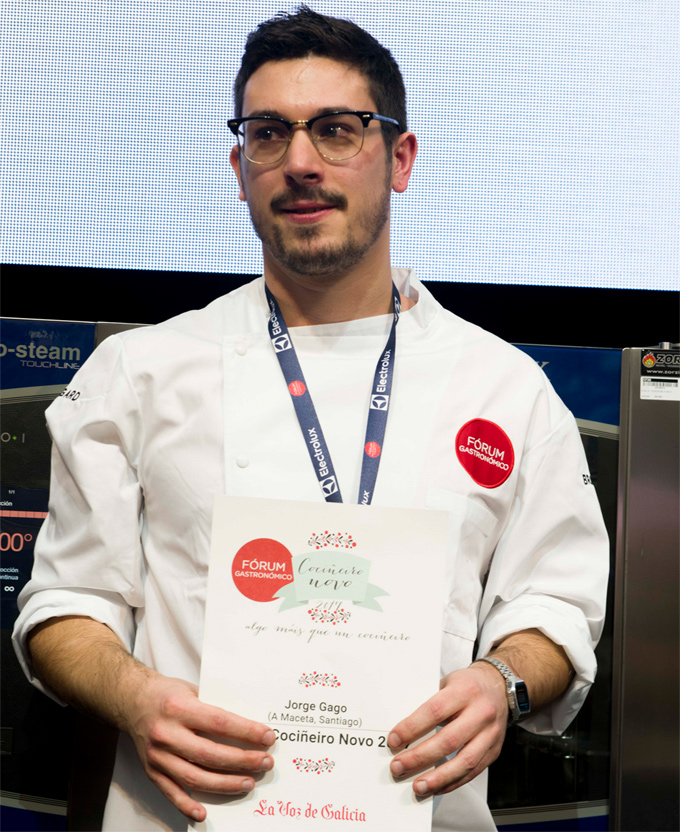 Finalmente ha sido Jorge Gago el receptor del Premio Cociñeiro Novo 2017, lo que significa que es un cocinero gallego emergente que tiene como prioridades trabajar con producto local, acceso a producciones ecológicas, preocupación por el medio ambiente y, entre otras cosas, difundir y promover esta filosofía en torno a la alimentación y a la cocina.