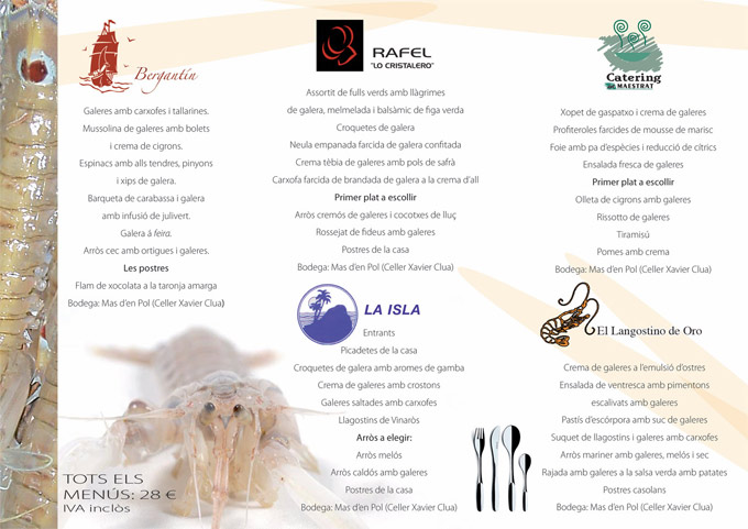 Los restaurantes de Vinaròs que participan en estas jornadas son: El Langostino de Oro (964451204), Bergantín (964455990), Rafel lo Cristalero (964402048), La Isla (964452358) y Càtering del Maestrat (964453555). Cada uno de ellos ha creado un menú degustación con galeras que os mostraremos a continuación, dichos menús estarán maridados con los vinos de la Bodega Xavier Clua (Terra Alta) y tienen un precio fijo de 28 euros (iva incluido).