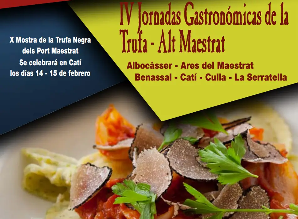 En las próximas semanas la trufa negra será la protagonista de eventos que se celebrarán en distintos municipios del Alto Maestrazgo, en Castellón, uno de ellos son las Jornadas Gastronómicas de la Trufa que han dado comienzo este fin de semana y que se extenderán hasta el 15 de marzo de 2015. Es la cuarta edición de estas jornadas gastronómicas que tienen lugar en Albocàsser, Ares del Maestrat, Benassal, Catí, Culla y La Serratella, y de las que se puede disfrutar todos los fines de semana entre las fechas indicadas de los meses de enero, febrero y marzo.