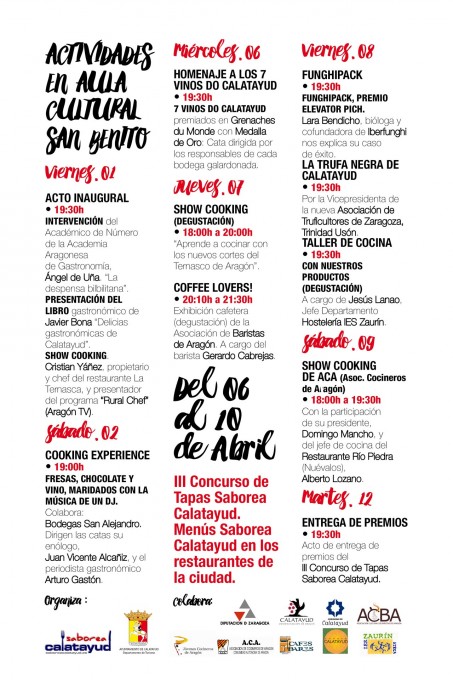 Por tercer año consecutivo se van a celebrar las Jornadas Gastronómicas Saborea Calatayud, un evento que, como en ediciones anteriores, se desarrolla con la finalidad de promocionar los productos agroalimentarios y la cocina local, proporcionando un impulso al sector hostelero y turístico. La tercera edición de Saborea Calatayud va a tener lugar del 1 al 10 de abril de 2016, así que este fin de semana empiezan las actividades que os contamos a continuación.