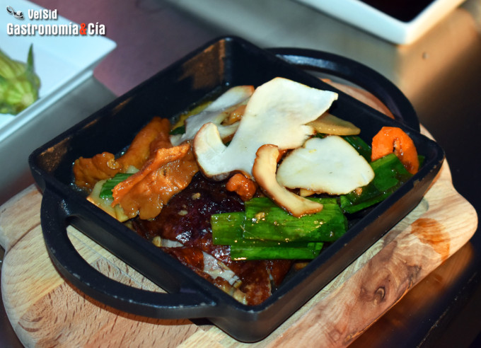 Tras esta explicación, el cocinero chino-catalán elaboró un plato de verduras con los condimentos habituales en su cultura, cebolleta, jengibre, ajo, bambú, setas, salsa de ostras, soja, etc. Estas verduras las sirve sobre el pato pekín una vez trinchado. Por cierto, otro de los tips que aportó el chef sobre la cocina asiática es el ingrediente que utilizan para espesar las salsas, y no es harina, es fécula de patata.