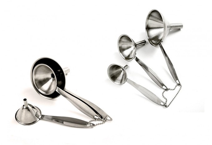 En la foto superior podéis ver un juego de embudos mini para realizar esta operación, entre muchas otras. El juego se compone de tres mini embudos de distinto tamaño, para que sean útiles con tarros, botellas u otros recipientes pequeños. Son de acero inoxidable, con la garantía del fabricante Norpro.