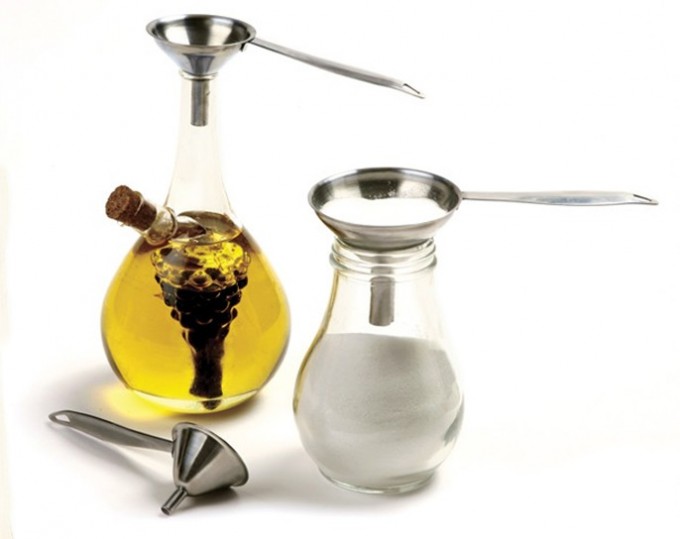 Pues como os comentábamos, aunque hemos puesto el ejemplo más básico para el que resulta muy práctico un embudo pequeño, el de rellenar una aceitera, también se puede utilizar para la vinagrera, para las salsas caseras que guardamos en botellas o en biberones, para los tarros de especias, para los molinillos de especias o de sal, etc.