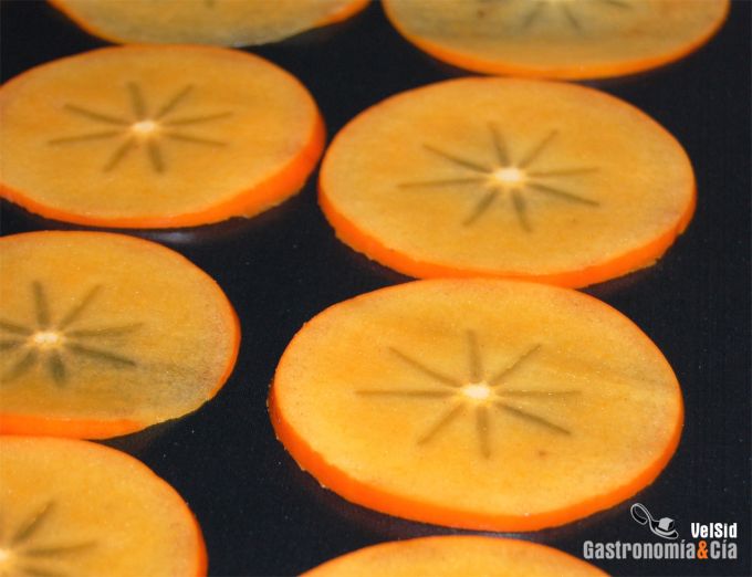 Lava los caquis y córtalos en finas rodajas, disponlos alineados en la bandeja del horno cubierta con tela de cocción (ideal la lámina de teflón), espolvorea con canela e introduce la bandeja en el horno precalentado a 180º C (modo turbo o con calor arriba y abajo).