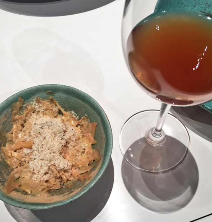 En un bol montar la crema de foie con los piñones, las migas, el gel de vino rancio, el kakigori, la sal de avellanas y la pimienta. Acompañar con la copa de vino rancio.