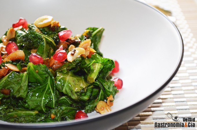 Sirve la col kale con las almendras y la salsa que haya quedado en la sartén y termina añadiendo unos granos de granada. También puedes añadir un hilo de aceite de oliva virgen extra o de sésamo, y si quieres un toque picante, añade un poco de shichimi togarashi. ¡Buen provecho!