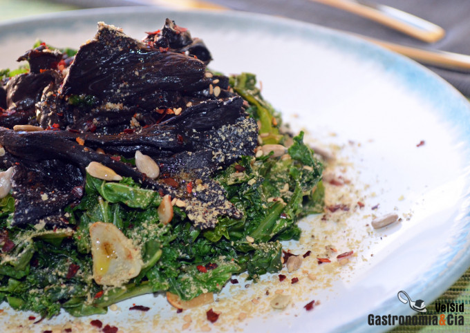 Tenemos que recomendaros preparar esta receta de col kale con trompetas de la muerte, semillas molidas (sésamo, calabaza, girasol, cáñamo, lino…), levadura nutricional y copos de pimentón ahumado, es un entrante muy fácil y rápido de elaborar y resulta muy nutritivo, además de estar delicioso. Se puede completar este plato con alguna proteína vegetal o animal al gusto, así que tomad la idea y preparad vuestro plato.