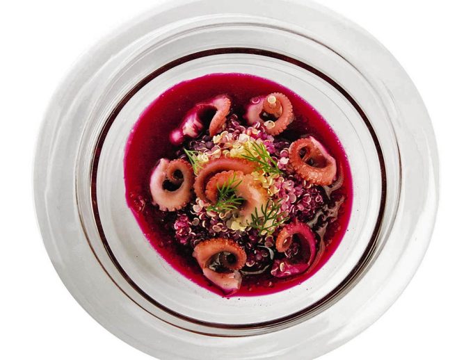 Colocar el chucrut de repollo y quinoa en la base con volumen, después las patas del pulpito alrededor. Servir la sopa de kimchi de remolacha con miso y finalizar con eneldo.