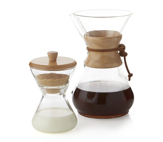 Se llama Handblown Cream & Sugar Set, y se define como el equilibrio perfecto entre forma y funcionalidad. Es evidente que este complemento está inspirado en el diseño de la icónica cafetera Chemex, es elegante y fino, y además funcional. Como dice su nombre, este accesorio para el servicio del café está pensado para llevar el azúcar y la leche (o crema de leche) a la mesa.