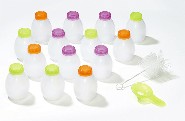Este kit o juego de botellas para hacer yogur para beber se compone de 14 botellas con una capacidad de 200 mililitros, un embudo para pasar el preparado de yogur a las botellas, un cepillo para limpiarlas y un pequeño recetario. Las botellas están fabricadas en polipropileno, libre de ftalatos o bisfenol A, son de color blanco translúcido y los tapones son de tres colores diferentes. Para poder guardarlos todos juntos, reduciendo el riesgo de que se extravíen, cuando no se están utilizando se pueden apilar, aunque quizá es preferible guardarlos cada uno con su botella.