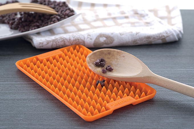 En principio, Kitchen Pad se ha concebido como soporte para apoyar cucharas, espátulas, cucharones y demás utensilios de cocina que utilizamos para cocinar, para mover el guiso, para batir la crema, etc. El tapete de silicona tiene una trama en forma de cono que permite recoger las grasas o las salsas que sobrantes, evitando que se encharque como un posa-cucharas tradicional.
