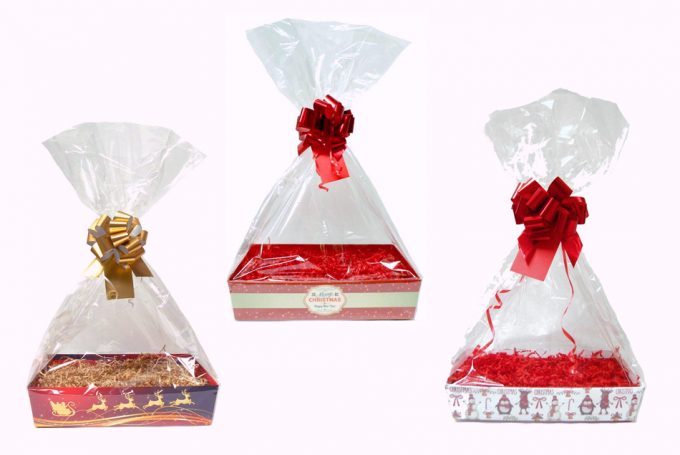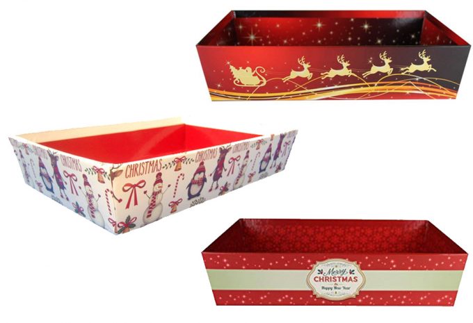 Volviendo a los kits para hacer cestas de Navidad para regalar, en las fotos podéis ver tres modelos que están disponibles en dos tamaños, el grande es de 35 centímetros de largo, 24 centímetros de ancho y 8 centímetros de alto, y el pequeño es de 30 centímetros de largo, 20 centímetros de ancho y 6 centímetros de alto. En ambos casos, la bandeja es de cartón resistente.