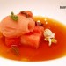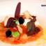 Nos explica que asa los pimientos con sarmientos y tomillo, conserva los pimientos cerrados para que suden y obtiene un caldo con sabor ahumado y a madera. Por otro lado infusiona flor de hibisco y agua de rosas en jugo de sandía licuado, mezcla con glucosa o un estabilizante y con ello se elabora el sorbete en Pacojet o sorbetera. Nos presenta un plato muy llamativo formado por el caldo de pimiento, dados de sandía y su sorbete, y acompaña con flores de saúco, milenrama, flor de melón y unas gotas de aceite.