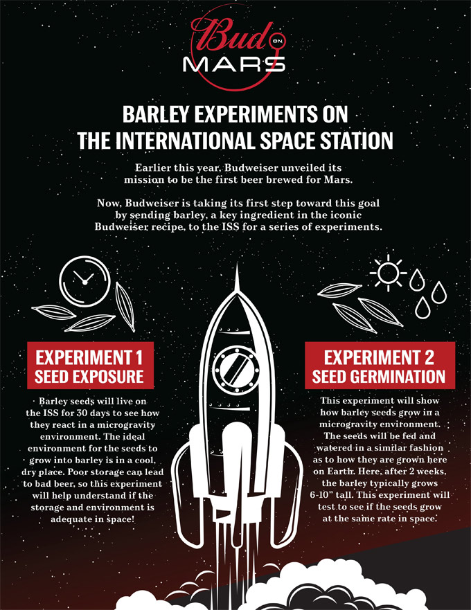 Según declaraciones de la marca cervecera, Budweiser siempre tiene como objetivo superar los límites de la innovación, por ello, ahora se inspira en el sueño americano de poder llegar al planeta Marte. La investigación se inicia con tiempo suficiente para que cuando llegue el momento se pueda preparar la cerveza en el planeta rojo. Está previsto realizar dos experimentos cuando lleguen los ingredientes a la estación espacial, el primero se centrará en la cebada, las semillas permanecerán durante 30 días en la estación a fin de comprobar cómo reaccionan ante las condiciones del espacio.