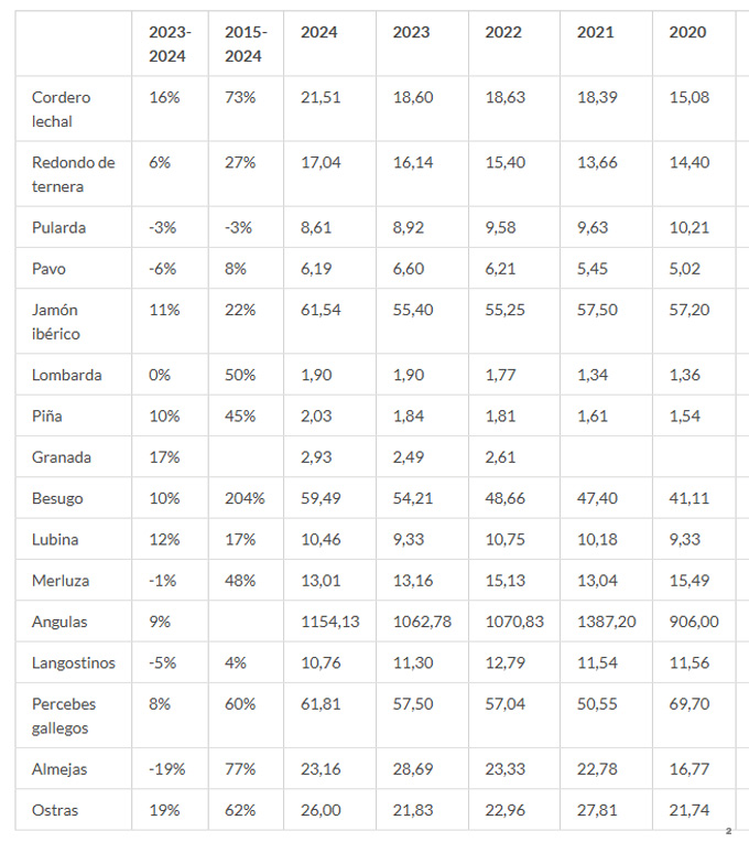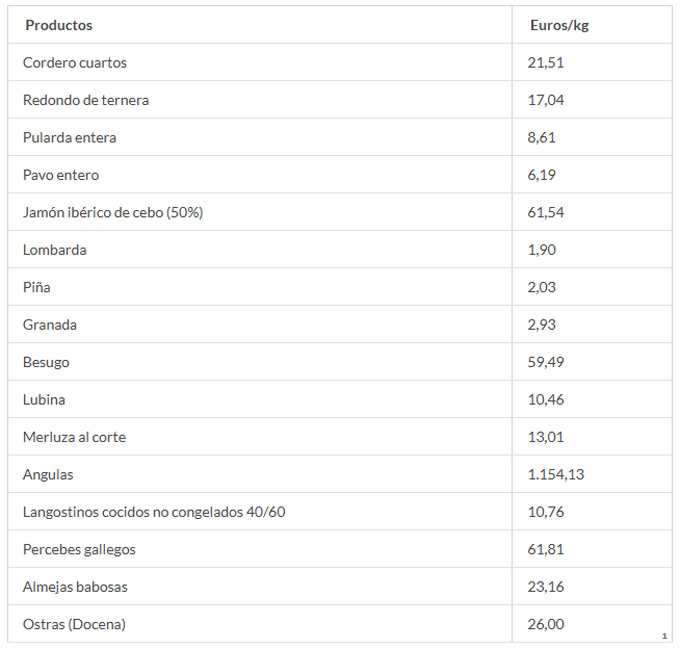 En cuanto a lo comentado anteriormente sobre los precios históricos de ciertos alimentos, son seis los que han alcanzado un precio que no se había visto antes: El cordero (21,51 €/kg), el redondo de ternera (17,04 €/kg), el besugo (59,49 €/kg), la lombarda (1,90 €/kg), la piña (2,03 €/kg) y la granada (2,93 €/kg). Y también hay alimentos que han bajado de precio, siendo los más destacados la pularda, el pavo y las almejas.