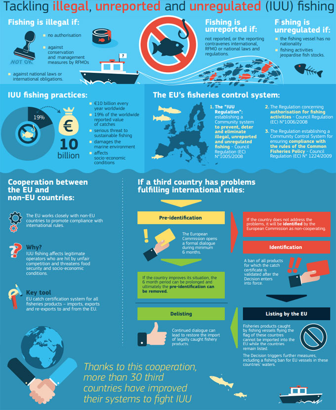 Las consecuencias no se hicieron esperar y un año después la UE imponía una tarjeta amarilla INDNR (pesca ilegal, no declarada y no reglamentada) a Tailandia por sus deficiencias en los sistemas de monitoreo, control y sanción de la pesca. El Reglamento INDNR tiene como objetivo asegurar que ningún producto pesquero capturado ilegalmente entre en el mercado de la UE, siendo necesario que se cumplan una serie de requisitos, como la trazabilidad, las normas de conservación y gestión, etc. Esta tarjeta amarilla se otorga al país que no coopera, por lo que se inicia un diálogo formal en el que la CE y el país en cuestión trabajan para resolver los problemas que preocupan.