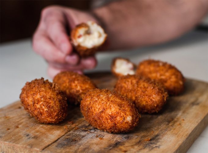 Hacer bolas de unos 30 gramos, pasar por harina, huevo y panko, y freír en aceite de girasol a 180º C unos 40 segundos. Retirar y dejar reposar sobre papel absorbente para que el calor llegue al centro y quede cremoso. Finalmente, servir y disfrutar.