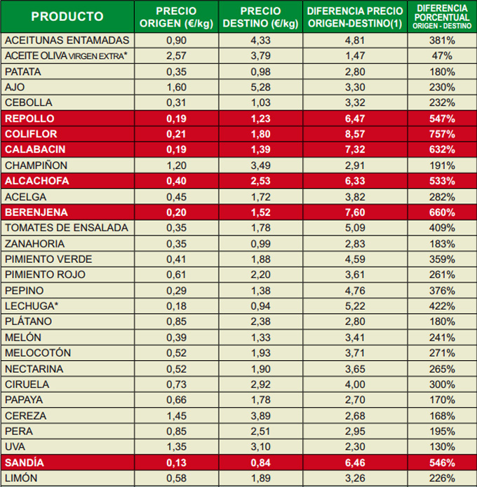 Las alcachofas son el último alimento que aparece destacado en color rojo y supera la barrera del 500% porcentual, en origen se cotizaron a 0’40 euros/kilo, los consumidores hemos pagado en el mercado una media de 2’53 euros por kilo, es decir, 6’33 veces el valor de las alcachofas en el campo, por lo que la diferencia porcentual se establece en un 533%.