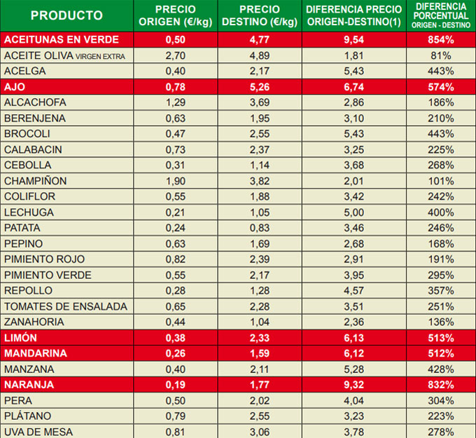 En el mes de noviembre, la diferencia de precio de las aceitunas en verde siguió subiendo y alcanzó el 854%, recordemos que en octubre la diferencia se estableció en un 613%, y en septiembre fue del 430%, por debajo de la barrera imaginaria del 500%. En el campo, las aceitunas bajaron el precio de venta 0’13 euros, estableciéndose en 0’50 euros por kilo, y en el mercado el precio medio se estableció en 4’77 euros/kilo, un céntimo menos que en octubre. Como vemos, los intermediarios no han trasladado la bajada de precios en origen aumentando su margen de beneficios, y según los datos, los consumidores pagamos 9’54 veces el valor de las aceitunas en el campo.