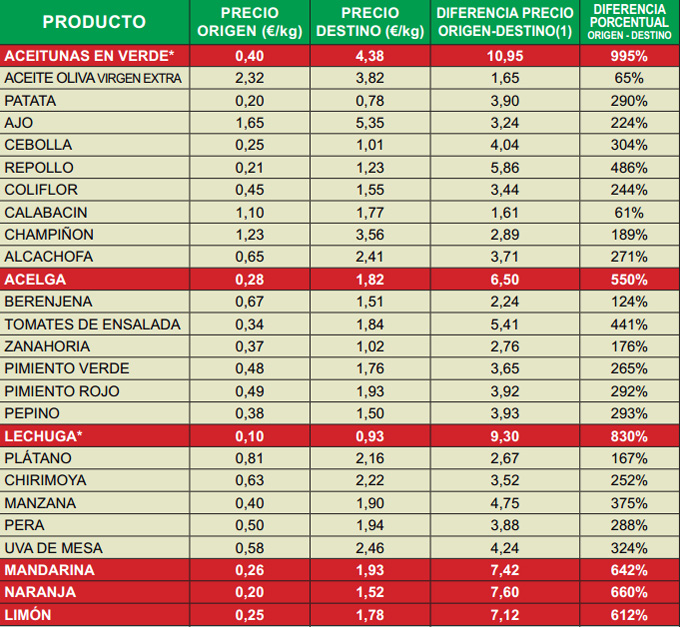 Otros alimentos desaparecen de la lista de productos que superan la barrera del 500% porcentual, el repollo, las berenjenas, los tomates de ensalada, el pepino, los melocotones… claro, que algunos de estos alimentos están fuera de temporada. Como hemos indicado en otras ocasiones, la abundancia no siempre se acompaña de buenos precios para los consumidores, al contrario, sirva como ejemplo el caso de los cítricos.