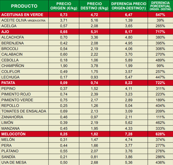 Clasificados en tercera posición aparecen los melocotones, su diferencia porcentual se ha reducido con respecto al mes de septiembre de forma poco significativa, pasando del 742% al 628%. En el campo se pagó a los agricultores 0’25 euros por kilo, 6 céntimos más que en septiembre, y en el mercado el consumidor pagó una media de 1’82 euros/kilo lo que supone un incremento de 2 céntimos, el margen de los intermediarios es lo único que siempre se mantiene estable.