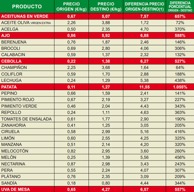 Las aceitunas en verde son el segundo producto destacado en este ranking de las diferencias especulativos de precio alcanzando el 657%, y como ocurre con los ajos, las aceitunas suelen aparecer como destacadas por superar la barrera imaginaria del 500%. El kilo de aceitunas se pagó a los productores a 0’67 euros, y en el mercado el precio medio se estableció en 5’07 euros, estos datos muestran que en el trayecto del campo a la mesa, las aceitunas en verde incrementaron su valor 7’57 veces.