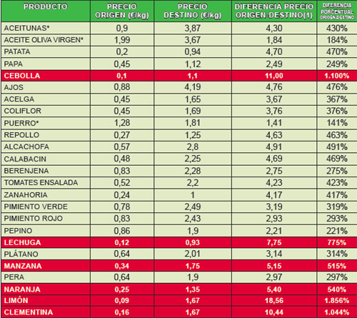 Aparecen en este ranking de las diferencias especulativas los ajos, se clasifican en tercera posición con una diferencia porcentual de un 570%, en origen se cotizó el kilo de ajos a 0’80 euros, lo que implica una bajada de precio de 0’15 euros. A los consumidores no se les ha trasladado esta reducción e incluso se ha tenido que pagar un céntimo más con respecto al mes de enero, siendo el precio medio por kilo en el mercado de 5’36 euros, lo que quiere decir que hemos pagado 6’70 veces el valor del producto en origen.