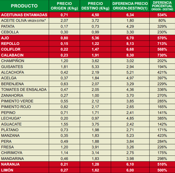 En cuarta posición aparece la coliflor, la diferencia porcentual se ha incrementado pasando del 496% al 568%, en origen se ha pagado una media de 0’22 euros por kilo, es decir, 6 céntimos menos que en el mes de enero. En este caso la reducción del precio en el campo sí se ha trasladado de forma notable al mercado, los consumidores hemos pagado una media de 1’47 euros por kilo de coliflor, lo que representa una reducción de 20 céntimos con respecto al mes de enero. En la lista de las diferencias porcentuales de origen-destino aparecen en quinta posición las aceitunas entamadas, se puede decir que los datos son similares a los del mes de enero.