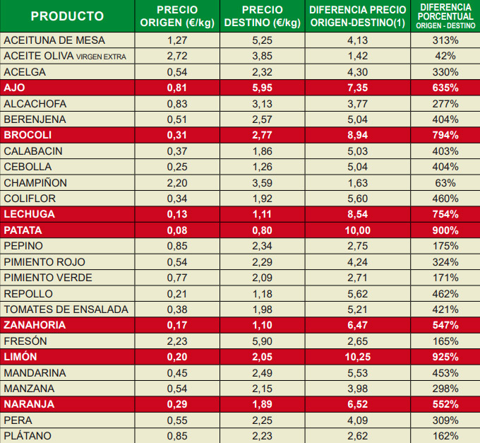 En segundo lugar, se clasifican las patatas en este particular ranking de las diferencias de precio especulativas, con una diferencia porcentual origen/destino del 900%, por lo que ya son cinco meses consecutivos en los que el precio de las patatas en el mercado sigue estando muy por encima de su valor en el campo. En origen, el precio del kilo de patatas se estableció en 0’08 euros, mientras los consumidores pagamos una media de 0’80 euros por kilo, es decir, en la trayectoria del campo a la mesa multiplicaron por 10 su valor.