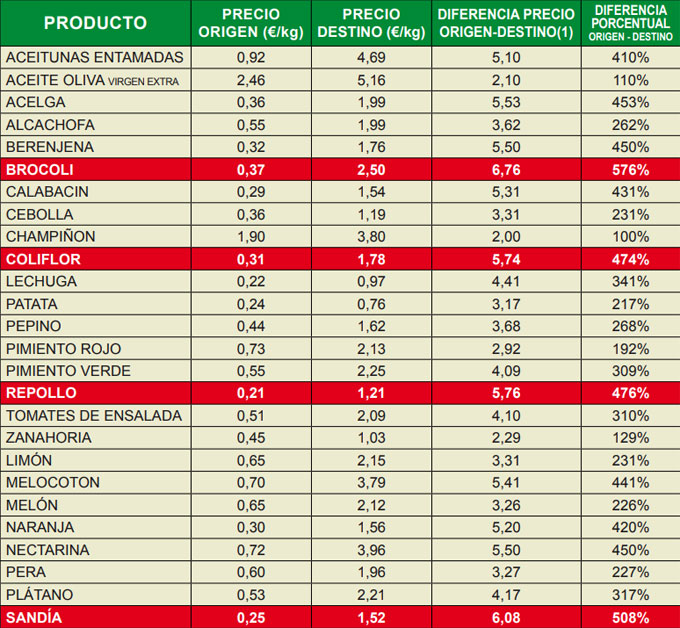 Lo más significativo del indicador presentado es la diferencia de precio del brócoli que se establece en un 576%, lo que supone una caída de la diferencia porcentual origen/destino de un 101%. En origen (el campo), el kilo de brócoli se cotizó a 0’37 euros, lo que supone un incremento de 7 céntimos con respecto al mes de abril, claro que, esta subida en el campo no la han asumido los intermediarios, se la han trasladado a los consumidores y además multiplicada, en el mercado su cotización pasó de 2’33 a 2’50 euros por kilo, lo que supone un aumento de 17 céntimos en relación al precio medio del mes de abril. Estos datos muestran que hemos pagado 6’76 veces el valor del brócoli en el campo.