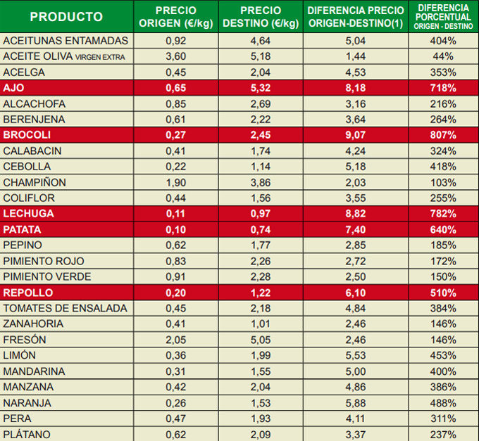 En segundo lugar aparece la lechuga con una diferencia porcentual del 782%, en el campo su cotización cayó pasando de 0’18 a 0’11 euros/kilo. Como en el caso del brócoli, la bajada de precios no se trasladó al consumidor e incluso se incrementó, pasando de 0’95 a 0’97 euros/kilo, lo que quiere decir que tuvimos que pagar 8’82 veces el valor de las lechugas en origen. En este caso es posible que las heladas y la demanda de este producto por países como el Reino Unido, hayan tenido que ver en la fluctuación de los precios.