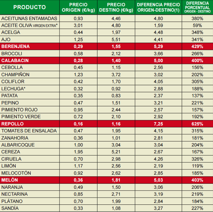 El resto de productos destacados en rojo en la tabla están por debajo de la barrera imaginaria del 500% de diferencia, pero se señalan por ser los que mayor diferencia presentan en el indicador del mes de junio. El segundo producto con mayor diferencia de precio es la berenjena, en origen se pagó al agricultor una media de 0’29 euros por kilo, lo que ha supuesto un incremento de 17 céntimos con respecto al mes de mayo, en destino (mercado) el consumidor ha pagado 3 céntimos menos, estableciéndose el precio en 1’55 euros por kilo. Hay que recordar que en el mes de mayo las berenjenas alcanzaron nada menos que una diferencia porcentual del 1.217%, un sobrecoste especulativo.
