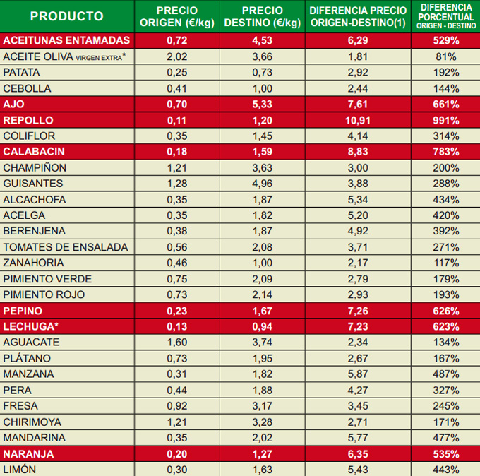 El siguiente alimento destacado en rojo en la tabla son las naranjas, en este caso prácticamente son los mismos datos del mes pasado, la diferencia porcentual se ha establecido en un 535%. En origen se cotizó el kilo a 0’20 euros (1 céntimo menos que en el mes de febrero) y los consumidores hemos pagado una media de 1’27 euros por kilo, en este caso la reducción se ha trasladado al consumidor. Finalmente, el último alimento destacado en el IPOD de marzo 2014 son las aceitunas entamadas, como en las naranjas, los datos son similares a los proporcionados en el mes de febrero. En origen se ha cotizado el kilo a 0’72 euros, un céntimo menos que en el mes de febrero, y los consumidores hemos pagado una media de 4’53 euros/kilo, 3 céntimos más que en el mes de febrero. El índice porcentual en este producto se ha establecido en un 529% porcentual, los consumidores hemos pagado 6’29 veces el valor del producto en origen.