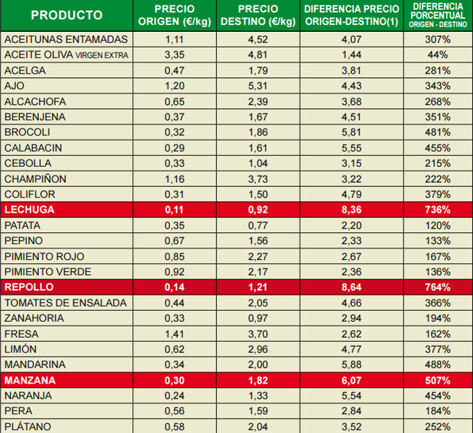 La lechuga es el segundo alimento destacado en el IPOD de febrero de 2016 por superar la barrera imaginaria del 500% (recordemos que al superar esta barrera el alimento se destaca con una franja roja). La diferencia origen/destino alcanzó en las lechugas el 736%, aunque hay que decir que en relación al mes de enero la diferencia se ha reducido significativamente, ya que entonces marcaba un 1.088%. En el campo, el kilo de lechugas se cotizó a 0’11 euros, 3 céntimos más que en el mes de enero, en el mercado los consumidores hemos pagado una media de 0’92 euros, lo que representa una reducción de 3 céntimos con respecto al mes de enero.