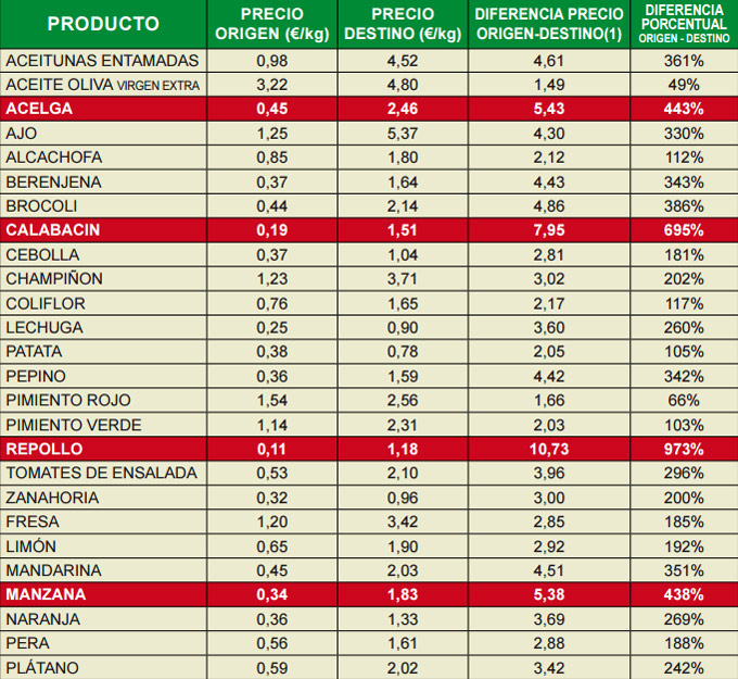En segundo lugar de este particular ranking de las diferencias de precio se clasifica el calabacín, en el campo ha caído su precio 10 céntimos, pasando de una cotización media de 0’29 a 0’19 euros kilo. Esta reducción también se ha trasladado al mercado, los consumidores han pasado de pagar 1’61 a 1’51 euros por kilo de calabacines. La diferencia porcentual origen-destino de este alimento se estableció en un 695%, lo que supone que hemos pagado 7’95 veces el valor de los calabacines en el campo.