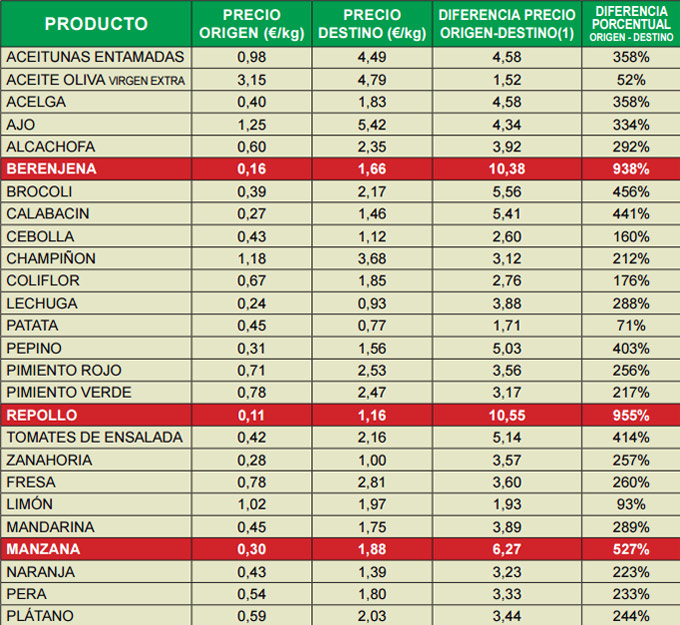 Los consumidores pagábamos en marzo 4’43 veces el valor de las berenjenas en origen, en abril hemos pagado 10’38 veces su valor en el campo. Aunque este alimento no encabece el ranking de las diferencias de precio, es el que mayor subida ha experimentado y sin que se haya producido ninguna situación que haya favorecido el incremento del precio, como por ejemplo una mala cosecha y falta de producto. De hecho, hay que decir que hace unos días los agricultores estaban regalando las berenjenas como protesta por la caída de precios que está afectando al sector hortofrutícola desde el inicio de la campaña.