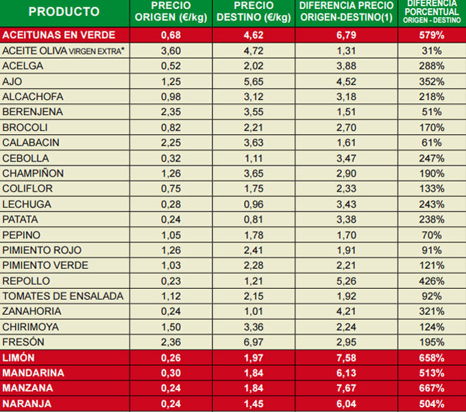Las aceitunas en verde se clasifican en tercer lugar en este ranking de las diferencias de precio, en el campo se pagó el kilo de aceitunas a 0’68 euros, en el mercado, los consumidores pagaron una media de 4’62 euros por kilo, lo que representa un incremento de 6’79 veces el valor de este producto en origen. El índice porcentual origen/destino se estableció en un 579%, la diferencia es notable con esta y otras variedades, recordemos que el pasado mes las cifras eran similares en las aceitunas entamadas.