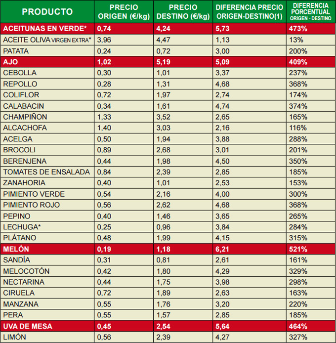La Coordinadora de Organizaciones de Agricultores y Ganaderos (COAG) ha publicado, como cada mes, los datos relativos al Índice de Precios en Origen y Destino de los Alimentos, indicador cuyo cometido es mostrarnos la diferencia del precio que se paga por algunos alimentos en origen (el campo) y el que pagamos los consumidores en el mercado. Con estos datos podemos tener una idea de los porcentajes que aplican los intermediarios, en algunas ocasiones son realmente elevados y no tienen más que una justificación, la de incrementar las ganancias de forma especulativa a costa de agricultores y consumidores.