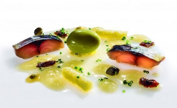 Salsear con el jugo de piparra, colocar una aceituna en el centro y aliñar el conjunto con aceite de oliva virgen extra. Terminar con cebollino picado por todo el plato y con unos cristales de sal sobre la caballa. Servir.