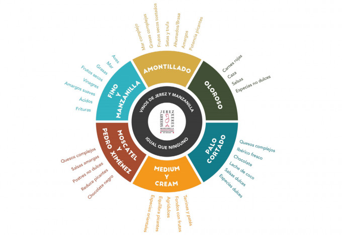 Fino y manzanilla: Aves, Mar, Grasas, Frutos secos, Vinagres, Amargos suaves, Ácidos, Frituras.