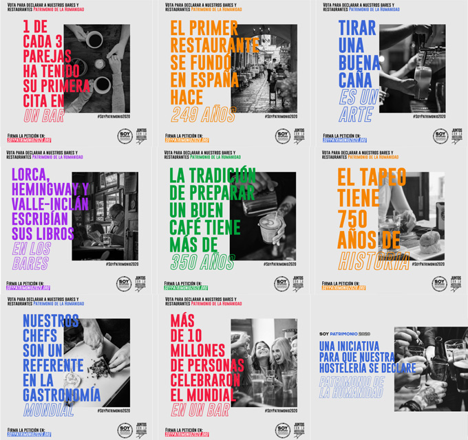 La hostelería española se postula como candidata a ser declarada Patrimonio de la Humanidad #SoyPatrimonio2020, y para ello, ha creado una plataforma online y ha lanzado una petición en Change.org con la que reunir firmas. En la web explican todo tipo de anécdotas de las que todos podríamos ser partícipes, ¿cuántas celebraciones se hacen en bares y restaurantes?, ¿cuántas primeras citas?, ¿cuánto futuro se ha escrito en una barra o en una mesa de un bar?