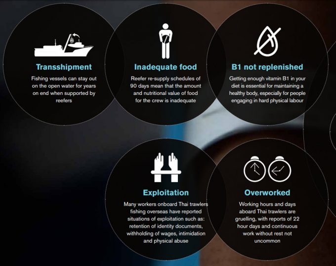Los pesqueros permanecen alejados y a ellos acceden buques frigoríficos para realizar el transbordo de la pesca realizada, de este modo, los infractores pueden estar fuera del alcance de las autoridades tailandesas y seguir utilizando trabajadores esclavos sometidos a todo tipo de abusos y vejaciones como las comentadas anteriormente. El exceso de trabajo, la mala alimentación, la falta de atención médica y estar largos periodos de tiempo en alta mar sin posibilidad de acceder a tierra, pasa factura a los trabajadores, según Greenpeace es una situación que provoca la muerte de trabajadores.