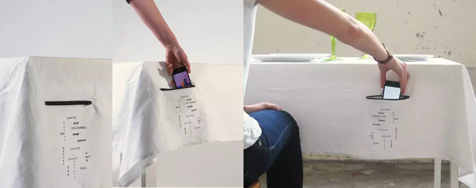 Con esta idea nace el concepto de mantel que podéis ver en la foto que ilustra estas líneas, un mantel con un bolsillo para guardar el móvil mientras estamos comiendo. Es un diseño de Paula O’Connor, diseñadora de interiores afincada en Dublín, Irlanda.